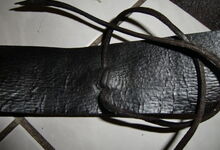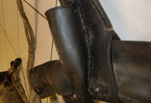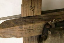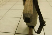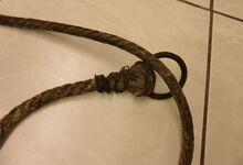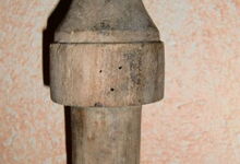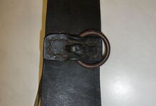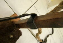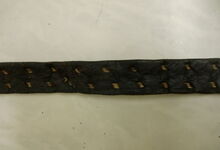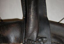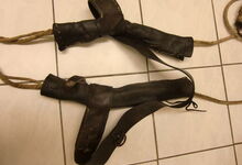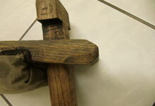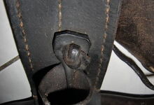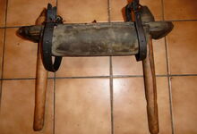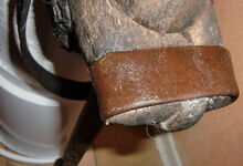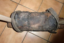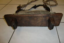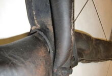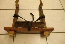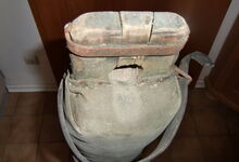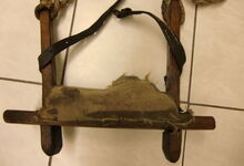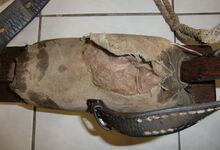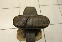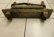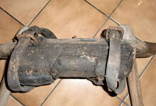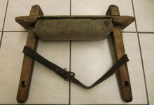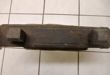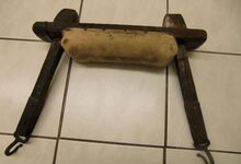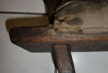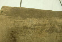 Folgend ein gut erhaltener Schub aus Regensburg; darüber genageltes Kunstleder hat den Original-Drell gut geschützt. Zwei nicht mehr vorhandene Leder?-Knöpfe haben dafür gesorgt, daß das Polster seine Form behielt.