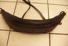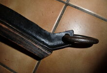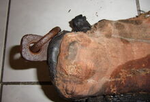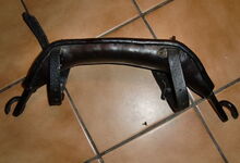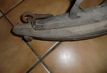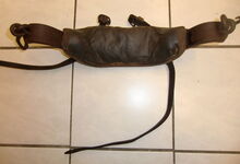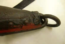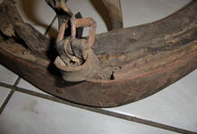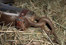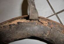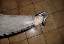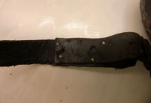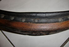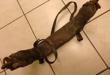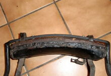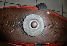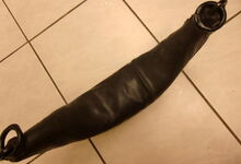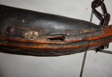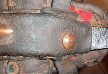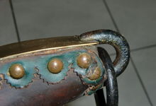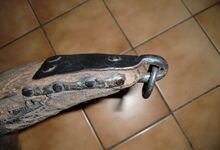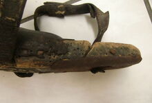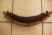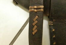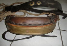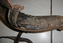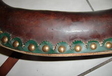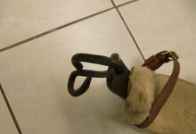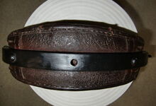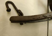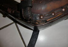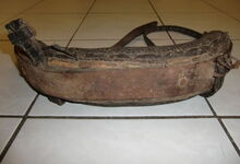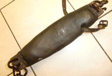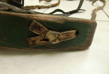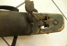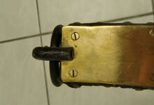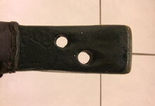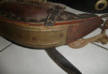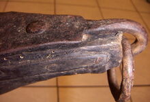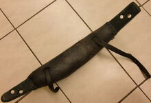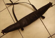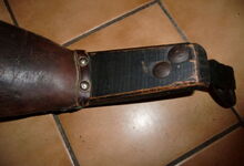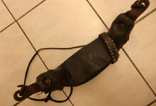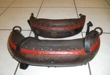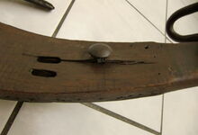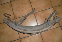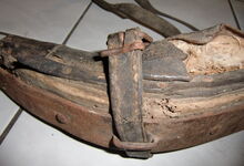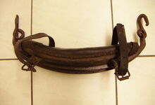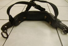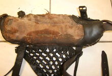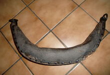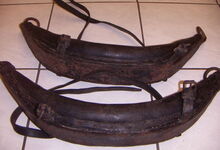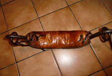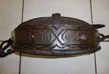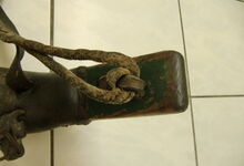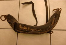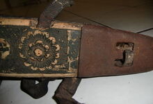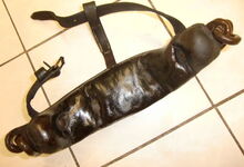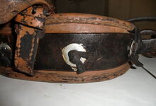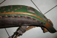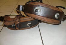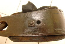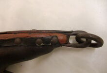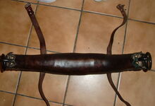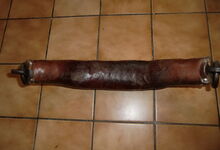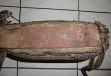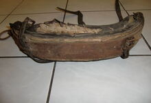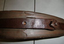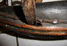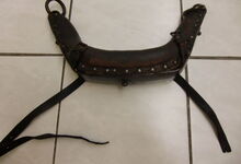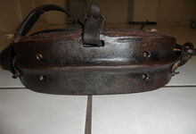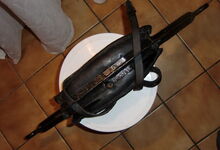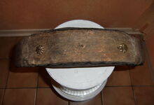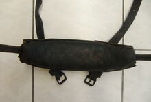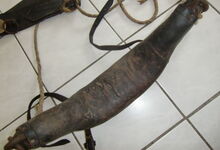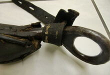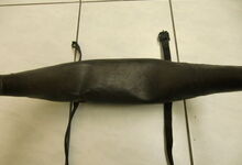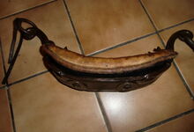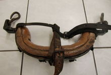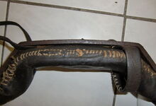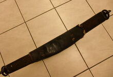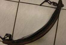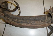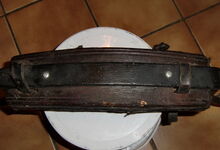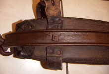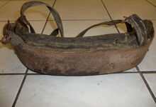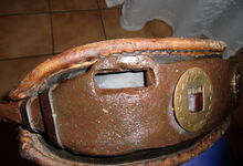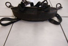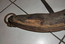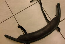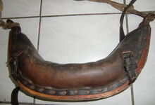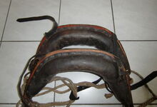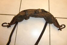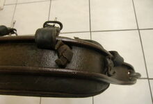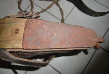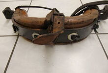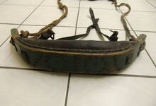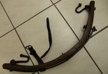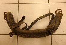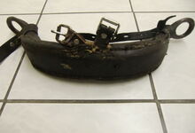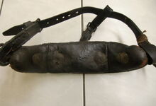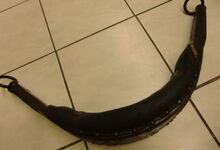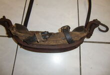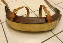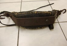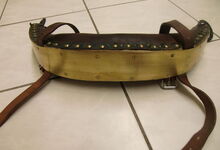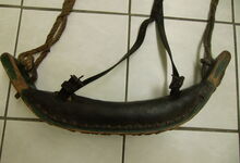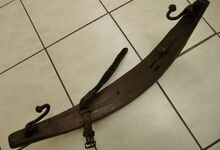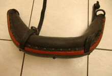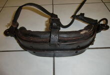 Das folgende Joch wurde zum Gebrauch hergerichtet: übernommen wurde die 3 Filzlagen als Polsterung (ursprünglich blau) und das Schnittmuster des Leders/der Filzlagen. Die Metallfeder fand sich zwischen Leder und schwarzem Eisenband, die Hornriemen liefen frei im selben Spalt und das Leder-/Filzpolster wurde von hinten mit Schrauben am Eisenband befestigt. Damit war der Ersatz von Verschleißteilen sehr einfach.