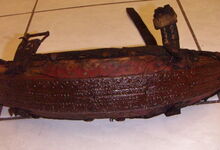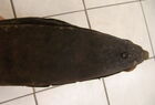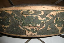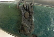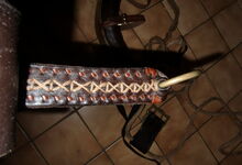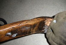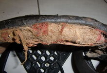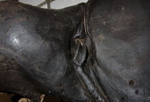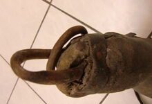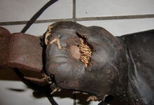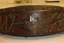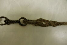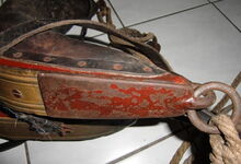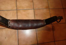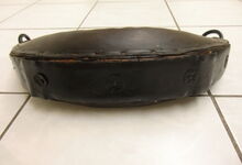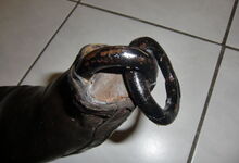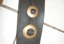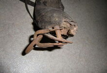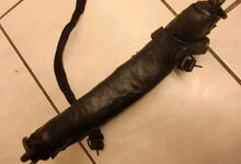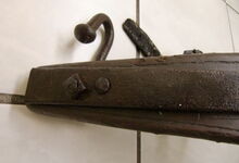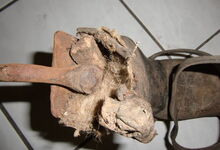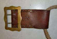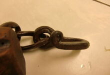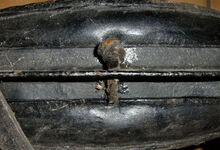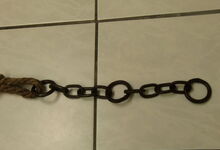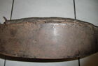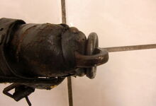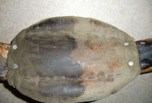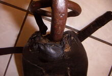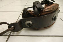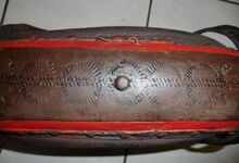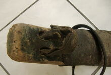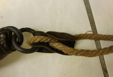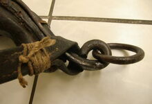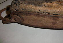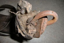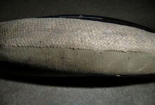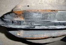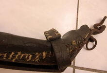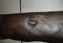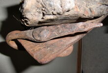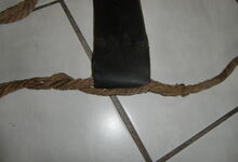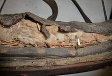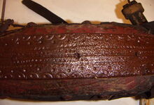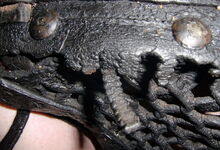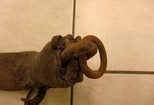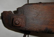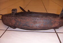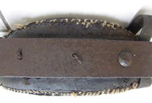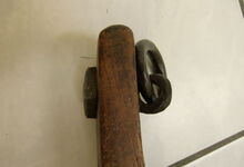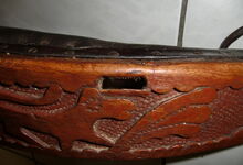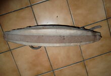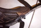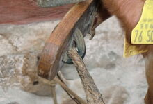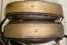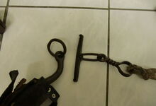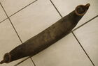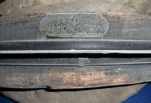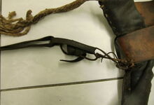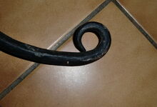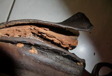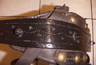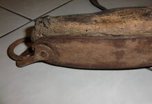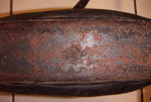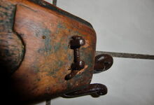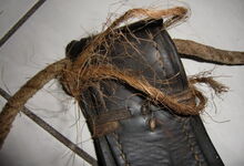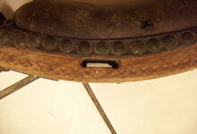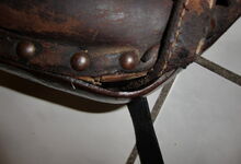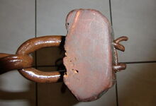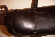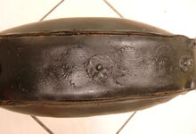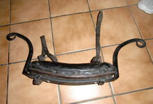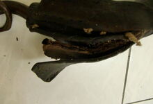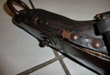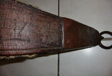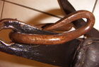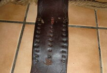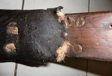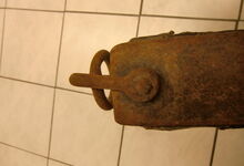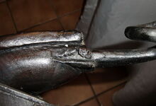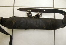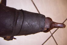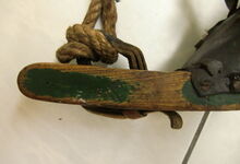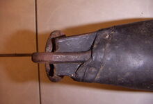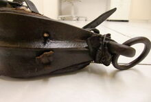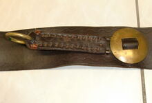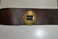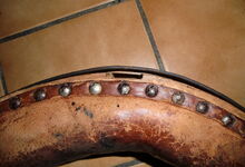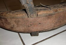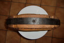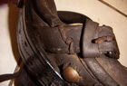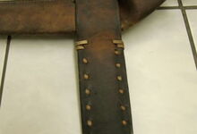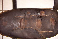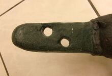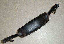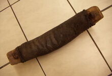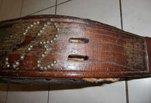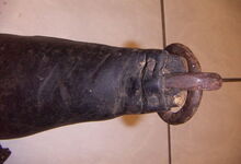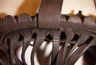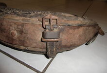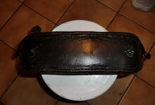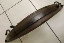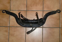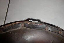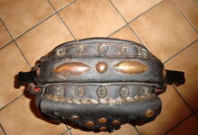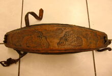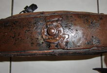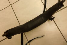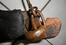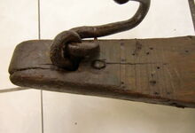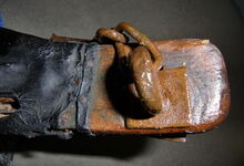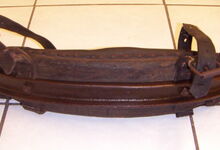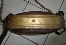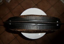 Das folgende Joch wurde zum Gebrauch hergerichtet: übernommen wurde die 3 Filzlagen als Polsterung (ursprünglich blau) und das Schnittmuster des Leders/der Filzlagen. Die Metallfeder fand sich zwischen Leder und schwarzem Eisenband, die Hornriemen liefen frei im selben Spalt und das Leder-/Filzpolster wurde von hinten mit Schrauben am Eisenband befestigt. Damit war der Ersatz von Verschleißteilen sehr einfach.