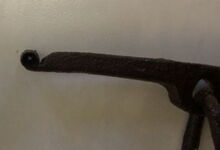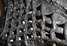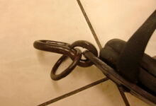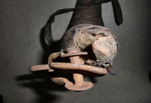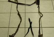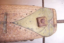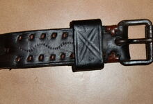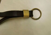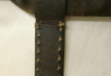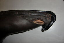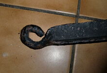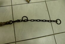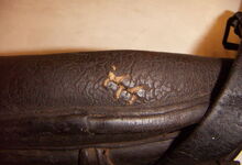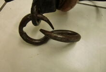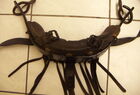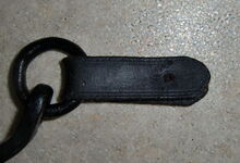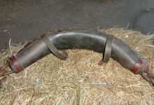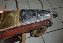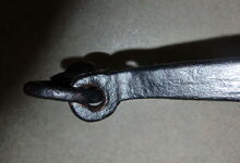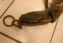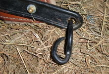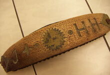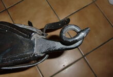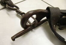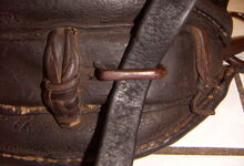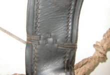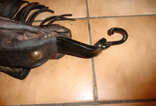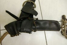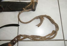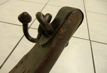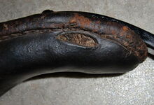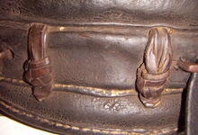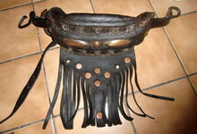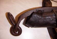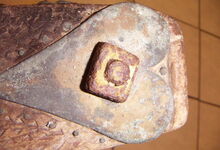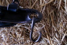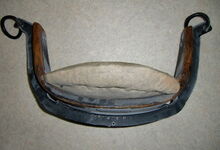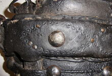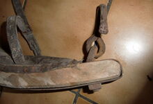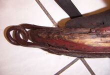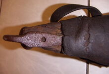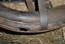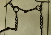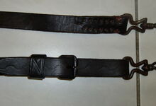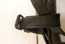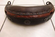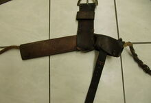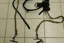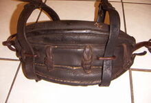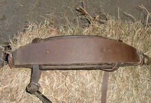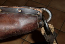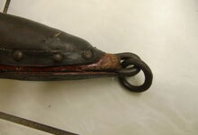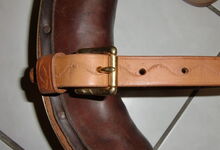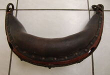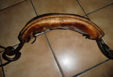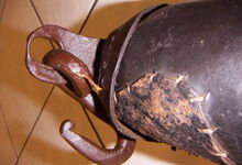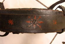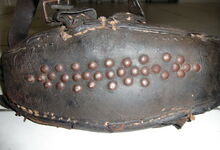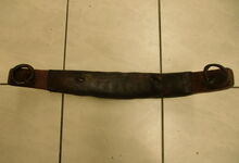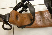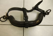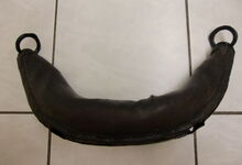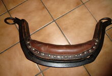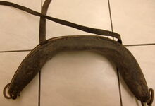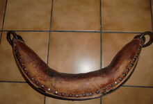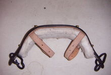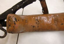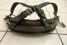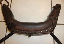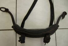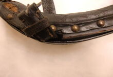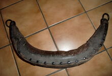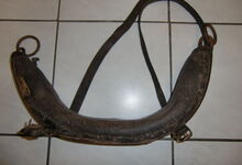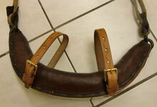 hat ähnlich wie die rheinisch-pfälzischen Stirnjoche abgekröpfte Enden am Metallbügel, dann Ösen und Zughaken. Ein dickes, einfach austauschbares Lederpolster schützt die Stirn.