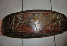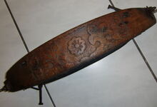 Bei diesem sehr leichten Stirnjoch ist das Holz gebogen (Kuhbogen) und läuft an beiden Enden etwas spitz aus. Dort befinden sich die Löcher (manchmal auch eiserne Haken, Ringe) für den Ansatz der Zugstränge. Die Polsterung mit Lederbezug ist in aller Regel direkt am Holz aufgenagelt. Die Riemen zur Befestigung an den Hörnern verlaufen hier kreuzweise, wodurch sich das Joch weniger leicht verschiebt.
